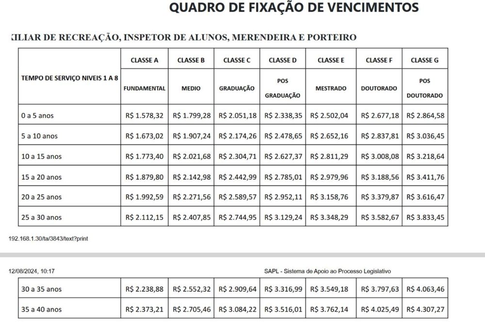 Plano de Cargos (Auxiliar de Recreação, Inspetor de Alunos, Merendeira e Porteiro)